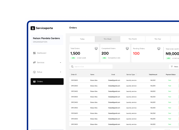 | ORT3453 | Ebuka Alu | Ebuka88@gmail.com | Laundry service | ₦6,000 | Paid | Pending |
